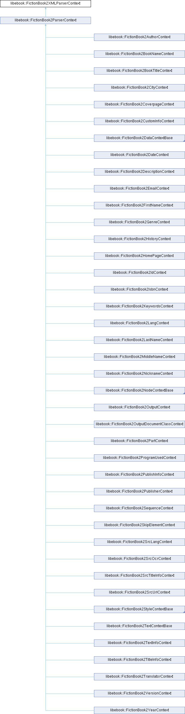 Implemented in libebook::FictionBook2AContext, libebook::FictionBook2AuthorContext, libebook::FictionBook2BookNameContext, libebook::FictionBook2BookTitleContext, libebook::FictionBook2CellContext, libebook::FictionBook2CityContext, libebook::FictionBook2CoverpageContext, libebook::FictionBook2CustomInfoContext, libebook::FictionBook2DataContextBase, libebook::FictionBook2DateContext, libebook::FictionBook2DescriptionContext, libebook::FictionBook2EmailContext, libebook::FictionBook2FirstNameContext, libebook::FictionBook2GenreContext, libebook::FictionBook2HistoryContext, libebook::FictionBook2HomePageContext, libebook::FictionBook2IdContext, libebook::FictionBook2InlineImageContext, libebook::FictionBook2IsbnContext, libebook::FictionBook2KeywordsContext, libebook::FictionBook2LangContext, libebook::FictionBook2LastNameContext, libebook::FictionBook2MiddleNameContext, libebook::FictionBook2NicknameContext, libebook::FictionBook2NodeContextBase, libebook::FictionBook2OutputContext, libebook::FictionBook2OutputDocumentClassContext, libebook::FictionBook2PartContext, libebook::FictionBook2ProgramUsedContext, libebook::FictionBook2PublisherContext, libebook::FictionBook2PublishInfoContext, libebook::FictionBook2SequenceContext, libebook::FictionBook2SkipElementContext, libebook::FictionBook2SrcLangContext, libebook::FictionBook2SrcOcrContext, libebook::FictionBook2SrcTitleInfoContext, libebook::FictionBook2SrcUrlContext, libebook::FictionBook2StyleContextBase, libebook::FictionBook2TextContextBase, libebook::FictionBook2TextInfoContext, libebook::FictionBook2TitleInfoContext, libebook::FictionBook2TranslatorContext, libebook::FictionBook2VersionContext, and libebook::FictionBook2YearContext.