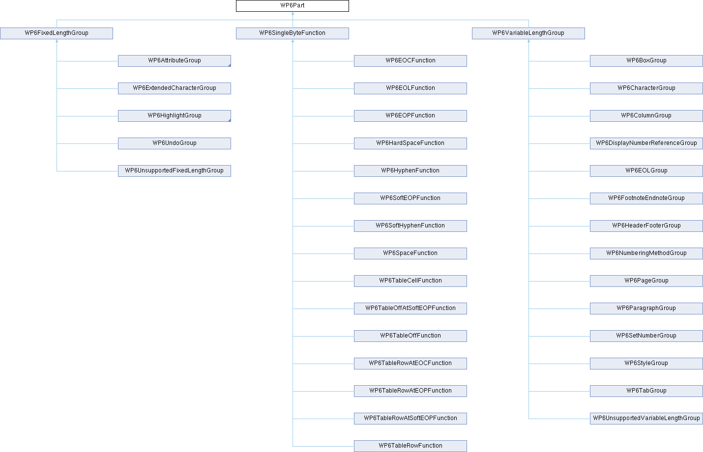 Implemented in WP6AttributeGroup, WP6AttributeOffGroup, WP6AttributeOnGroup, WP6BoxGroup, WP6CharacterGroup, WP6ColumnGroup, WP6DisplayNumberReferenceGroup, WP6EOCFunction, WP6EOLFunction, WP6EOLGroup, WP6EOPFunction, WP6ExtendedCharacterGroup, WP6FootnoteEndnoteGroup, WP6HardSpaceFunction, WP6HeaderFooterGroup, WP6HighlightGroup, WP6HighlightOffGroup, WP6HighlightOnGroup, WP6HyphenFunction, WP6NumberingMethodGroup, WP6PageGroup, WP6ParagraphGroup, WP6SetNumberGroup, WP6SoftEOPFunction, WP6SoftHyphenFunction, WP6SpaceFunction, WP6StyleGroup, WP6TabGroup, WP6TableCellFunction, WP6TableOffAtSoftEOPFunction, WP6TableOffFunction, WP6TableRowAtEOCFunction, WP6TableRowAtEOPFunction, WP6TableRowAtSoftEOPFunction, WP6TableRowFunction, WP6UndoGroup, WP6UnsupportedFixedLengthGroup, and WP6UnsupportedVariableLengthGroup.