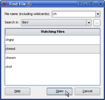 By pressing the 'Open' button the currently selected file will be opened. By default, the first file in the list of matching files is selected. Another way of opening a file is to simply double click the displayed file name.