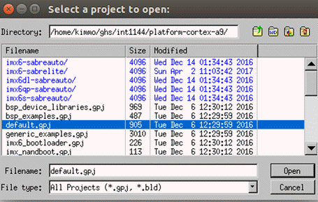 - In your INTEGRITY installation, select the project file default.gpj under the platform-cortex-a9 folder: