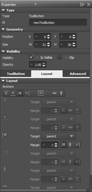 0. These settings makes sure that the tool buttons are adjacent to each other. - Set the iconName and iconSource properties in the ToolButton tab. The iconName should be set to a unique name identifying the icon name while the iconSource property should be set to the name of the icon for the tool button.