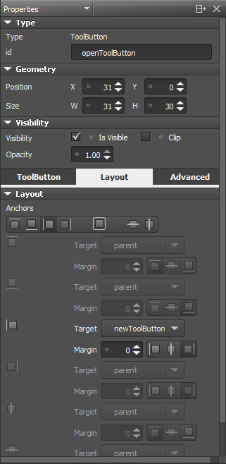 Similarly for the Open tool button, the margins are set to 0 but the left anchor is set to the New tool button.