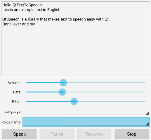 Hello Speak example demonstrates how QTextToSpeech can be used to read out text, as well as control the pitch, volume, and rate of the speech. It also lets you select a language and voice, if additional languages and voices are found.
